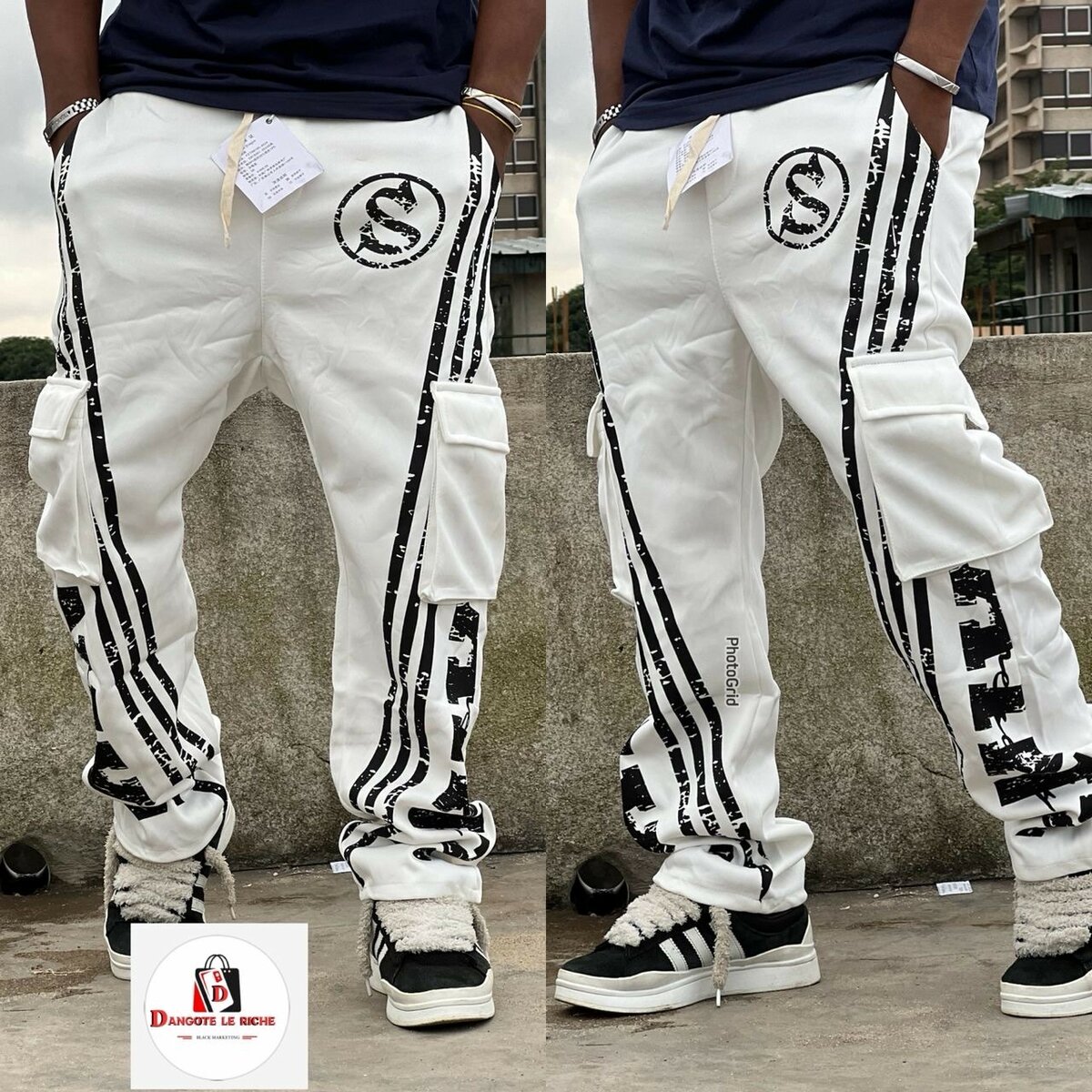 Pantalon cargo blanc pour homme au style streetwear tendance, idéal pour un look urbain. Avec des poches spacieuses et des détails noirs, perfect pour tous ceux qui cherchent à se démarquer dans la mode urbaine.