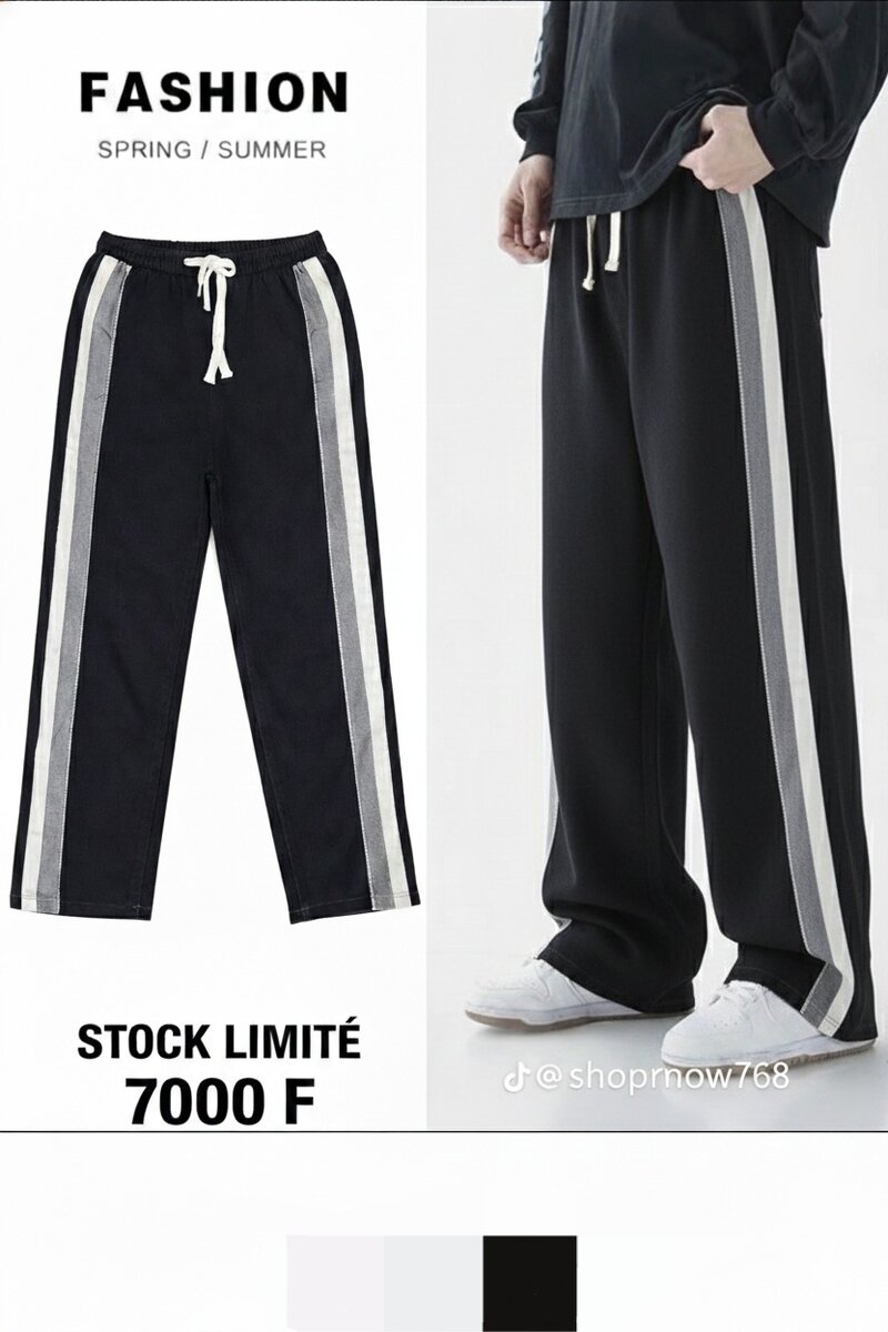 Découvrez ce pantalon de jogging moderne avec des bandes latérales contrastées. Parfait pour les activités sportives ou détente, il offre confort et style pour la saison printemps/été. Taille élastique avec cordon pour un ajustement parfait. Idéal pour un look décontracté et tendance.
