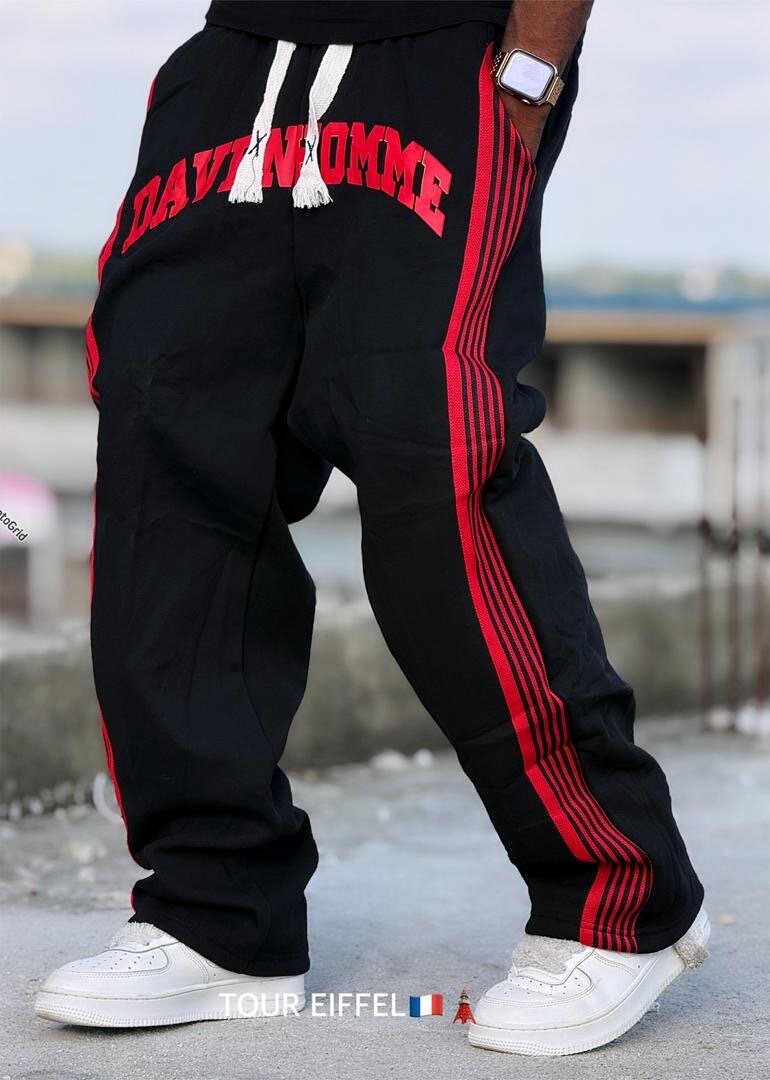 Pantalon de sport pour homme en noir avec des bandes rouges et un design moderne. Confortable pour les entraînements ou les loisirs, il s'ajuste parfaitement avec un cordon. Idéal pour un look décontracté et sportif.