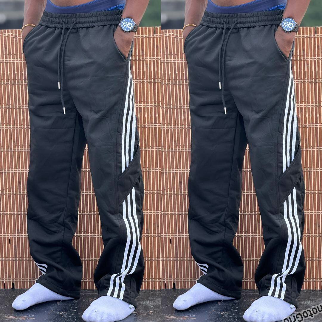 Pantalon de sport noir pour homme avec bandes blanches. Idéal pour le sport ou les loisirs, confortable et stylé. Parfait pour un look décontracté et actif.