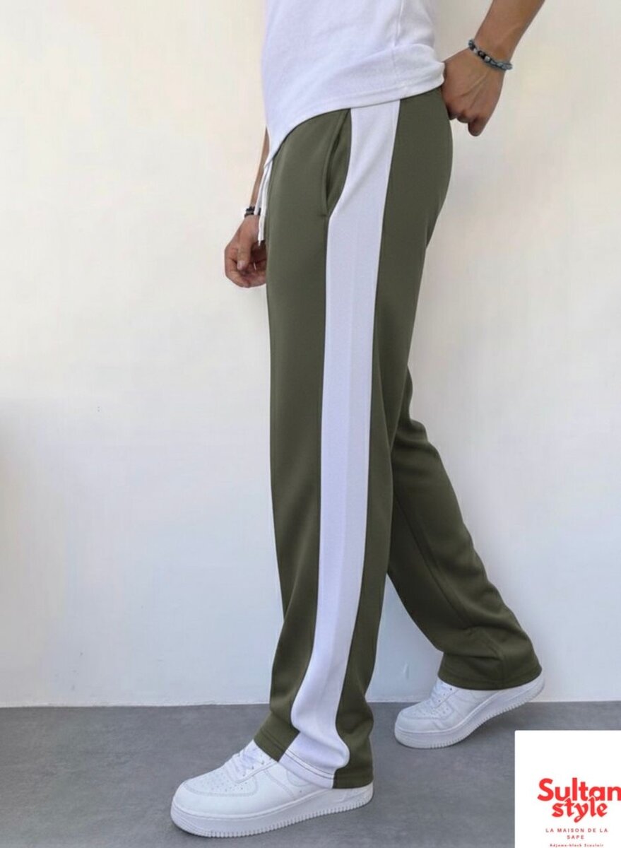 Pantalon de sport vert avec bande blanche sur le côté. Confortable et élégant, idéal pour le sport ou les activités quotidiennes.