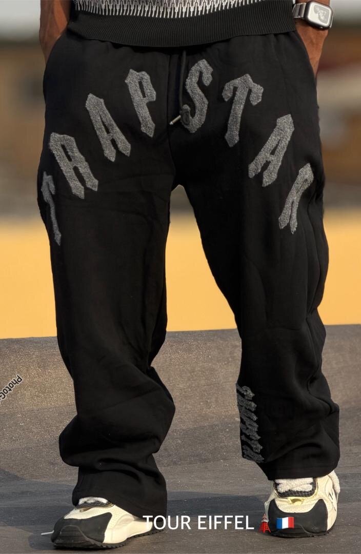 Pantalon de survêtement noir pour homme avec impression 'Trapstar'. Confortable et élégant, parfait pour le sport ou les activités décontractées.