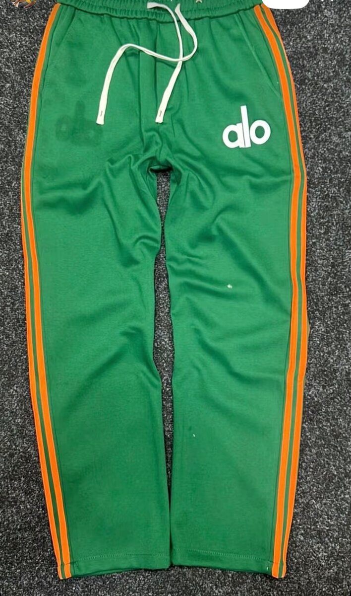 Pantalon de survêtement vert avec bandes orange sur les côtés et logo 'alo' sur le devant. Conçu pour le confort et le sportwear. Idéal pour les activités sportives ou pour un look décontracté.