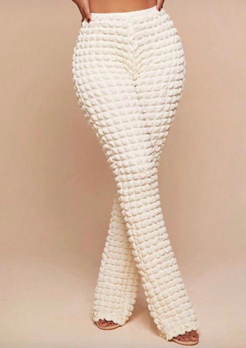 Pantalon texturé blanc pour femme, idéal pour un look élégant et tendance. Confortable et chic, parfait pour les occasions spéciales ou le quotidien. Tissu de qualité avec design unique.