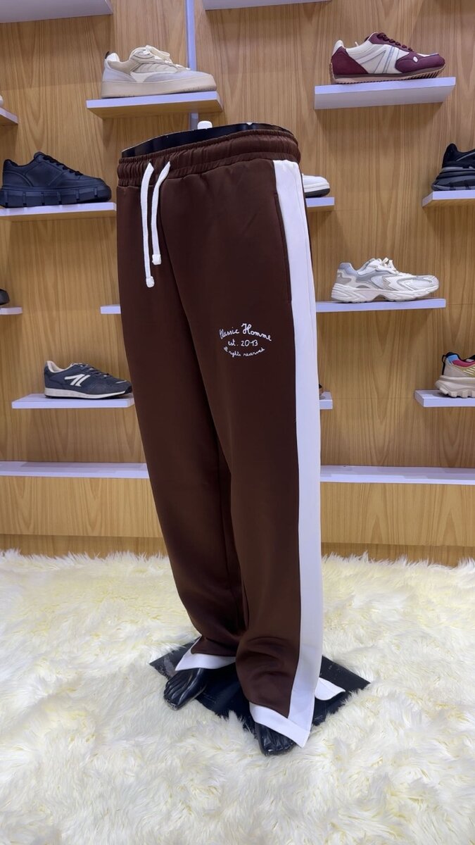 Découvrez ce pantalon jogging marron, idéal pour un style décontracté et sportif. Doté de rayures blanches sur les côtés et d'une taille élastique avec cordon, il offre un confort optimal. Parfait pour vos séances de sport ou pour un look casual au quotidien. Disponible en tailles L.