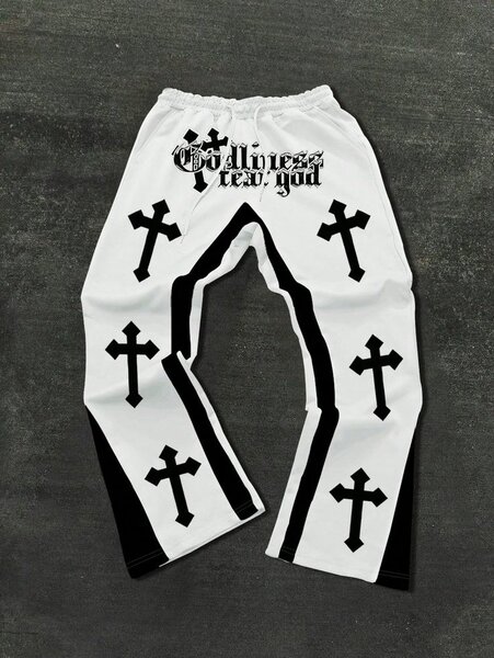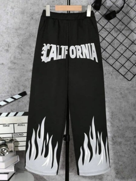 Pantalon ample bleu ciel avec dessins de flammes jaunes et croix. Confortable et tendance, idéal pour un look streetwear.