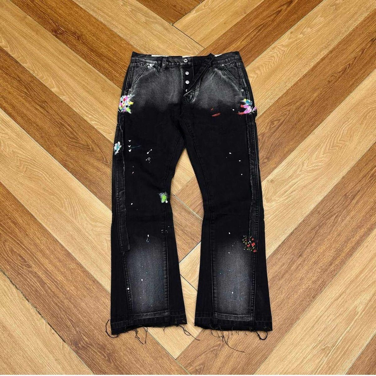 Découvrez notre pantalon noir unique avec éclaboussures de peinture, parfait pour une tenue audacieuse et créative. Design moderne et coupe confortable pour un look exceptionnel.