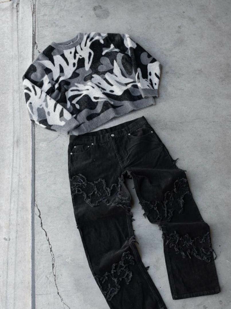 Pantalon noir déchiré avec détails en dentelle. Parfait pour un style streetwear. Associez-le au sweat camouflage pour un look urbain.