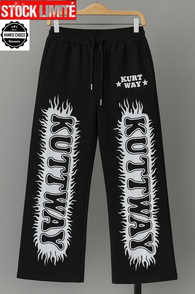 Optez pour le style audacieux avec ce pantalon streetwear noir. Parfait pour une tenue décontractée tendance, il se distingue par son design flamme accrocheur. Idéal pour un look urbain unique et décontracté.