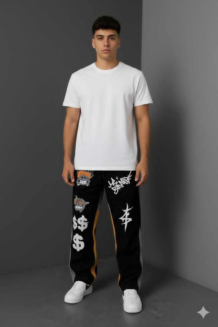 Optez pour ce pantalon streetwear unique avec motifs audacieux. Idéal pour un look urbain tendance, ce pantalon confortable et stylé se mariera parfaitement avec un t-shirt basique ou une veste en jean.
