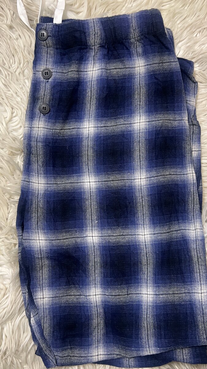 Pantalon pyjama élégante en tissu à carreaux bleus, idéale pour un look chic et décontracté. Confortable et facile à associer.