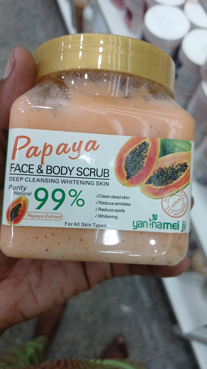 Experience deep cleansing with our Papaya Face & Body Scrub. This natural exfoliant is enriched with 99% papaya extract to reduce wrinkles, cleanse dead skin, and whiten the complexion. Ideal for all skin types, it reduces spots and provides a refreshed glow. Perfect for daily use.
