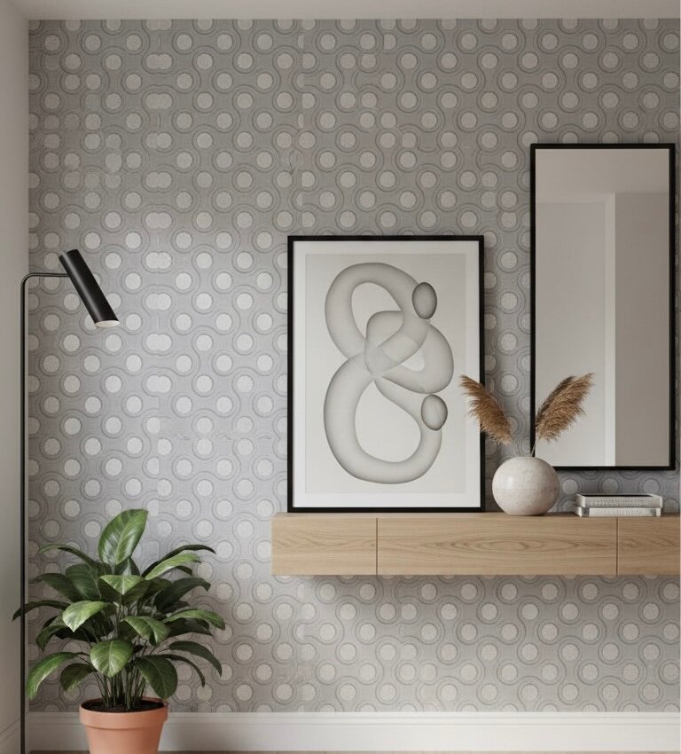 Transformez votre espace avec ce papier peint moderne aux motifs ronds. Parfait pour un salon, un bureau ou une chambre, il apporte une touche élégante et contemporaine à votre intérieur. Facile à appliquer et durable, c'est le choix idéal pour une décoration tendance et sophistiquée.