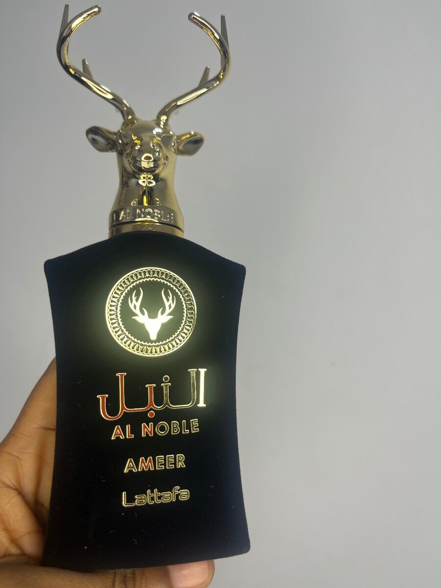 Découvrez le parfum Al Noble Ameer pour homme. Son flacon élégant avec un bouchon en forme de cerf apporte une touche de luxe. Profitez d'une fragrance unique et envoûtante qui vous distinguera en toute occasion. Idéal pour les moments spéciaux, ce parfum reflète la sophistication et le charisme.