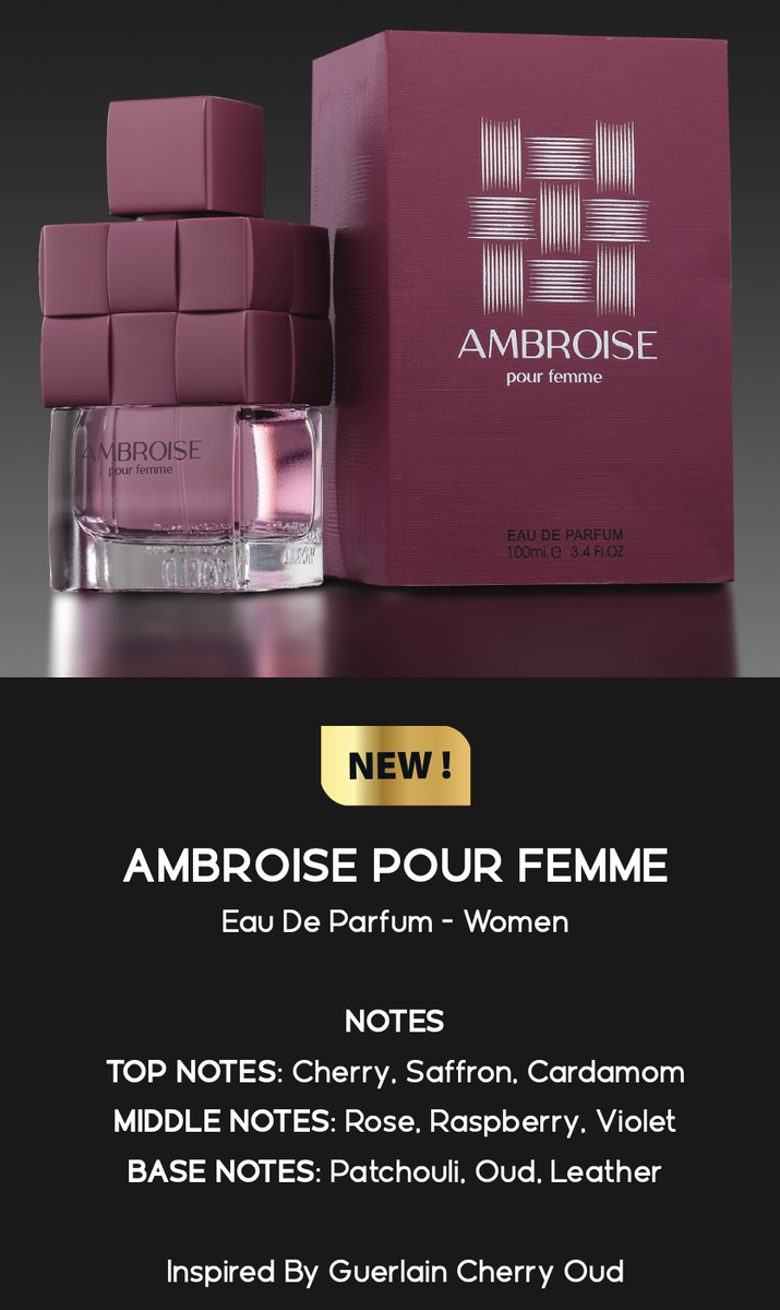 Découvrez Ambroise pour Femme, un parfum envoûtant aux notes de cerise, rose et oud. Idéal pour une soirée élégante.