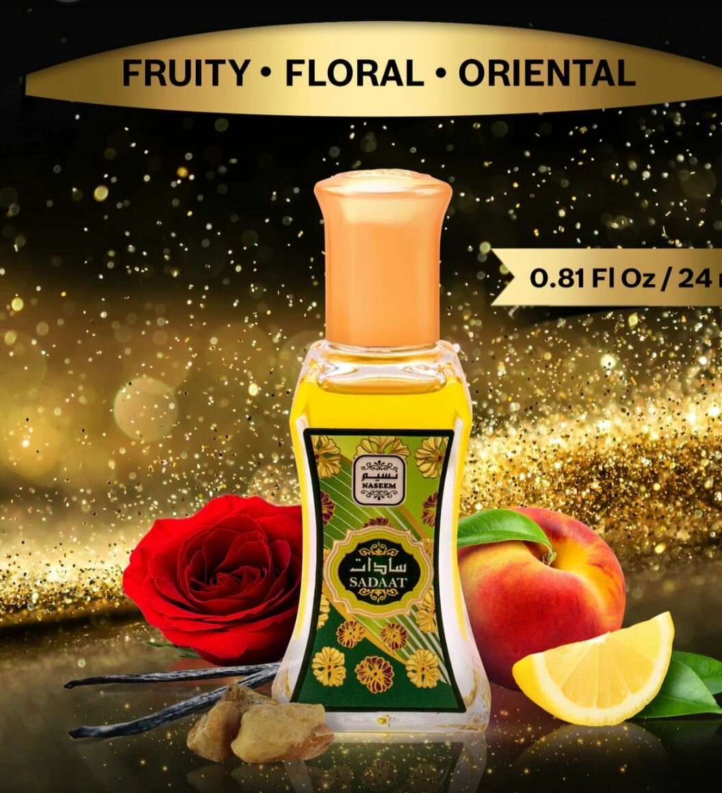 Découvrez Sadaat, un parfum concentré fruité, floral et oriental. Ce parfum roll-on de 24 ml est idéal pour les hommes et les femmes. Sa formule intense offre une longue tenue. Parfait pour une utilisation quotidienne ou pour des occasions spéciales.
