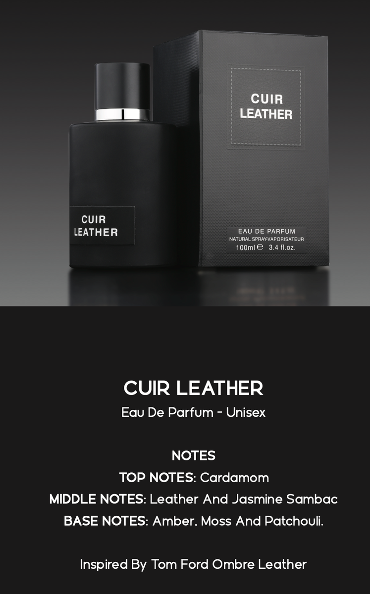 Découvrez l'élégance du parfum Cuir Leather. Notes vibrantes de cardamome, cuir, jasmin sambac, ambre, mousse et patchouli. Parfait pour toute occasion.