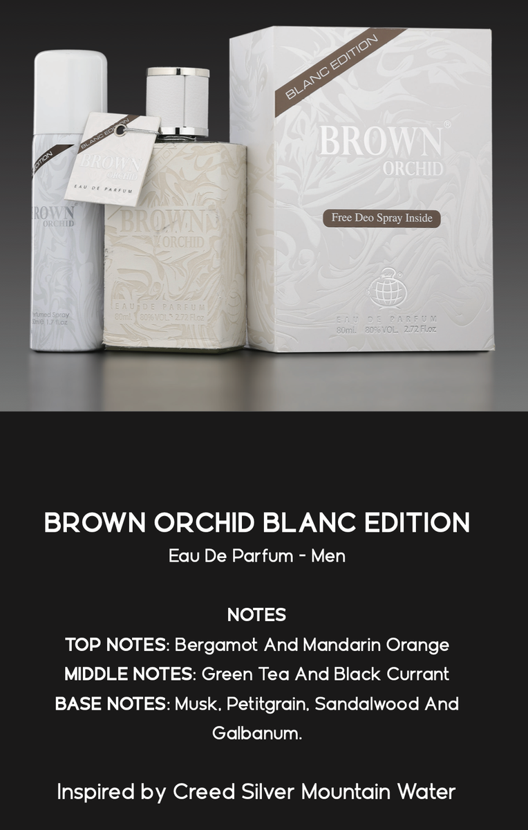Découvrez l'Édition Blanc de Brown Orchid pour homme. Un parfum captivant aux notes de bergamote, thé vert et musc. Inspiré par Creed Silver Mountain Water, il est idéal pour la confiance et le charisme quotidien.