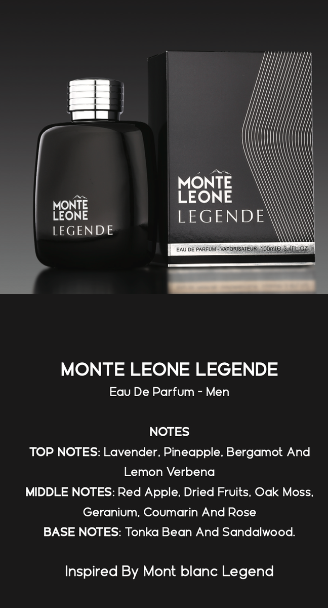 Découvrez Monte Leone Legende, un parfum masculin captivant avec des notes de tête de lavande et ananas, cœur de pomme rouge et mousse de chêne, base de fève tonka et bois de santal. Parfait pour l'homme moderne.