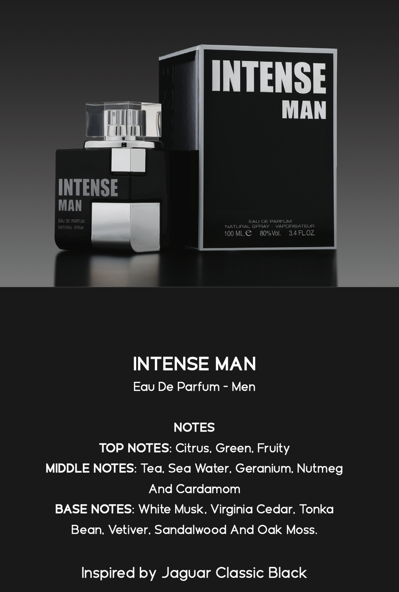 Découvrez l'élégance du Parfum Intense Man, avec des notes fraîches de citrus et de musc blanc. Parfait pour un homme moderne et sophistiqué.
