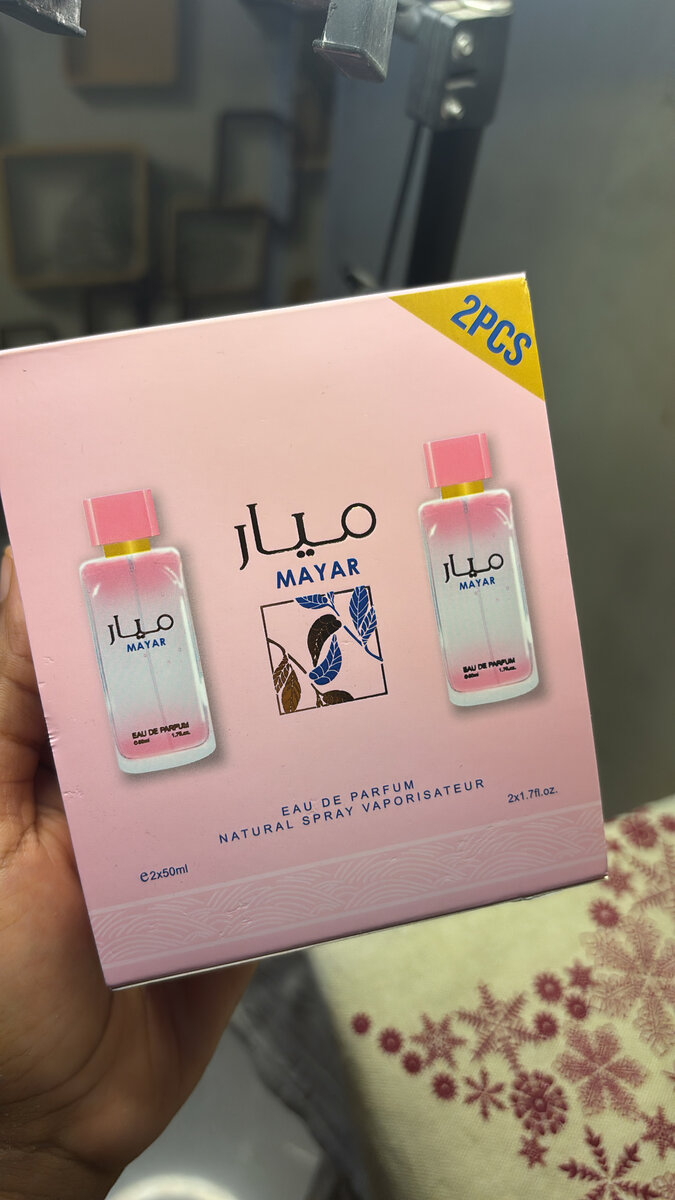 Découvrez la fragrance élégante et captivante de Mayar. Ce duo de parfums, présenté dans un design chic, est parfait pour toutes occasions. Profitez d'une senteur luxueuse qui dure toute la journée. Idéal pour offrir ou se faire plaisir. 2 à 4mil