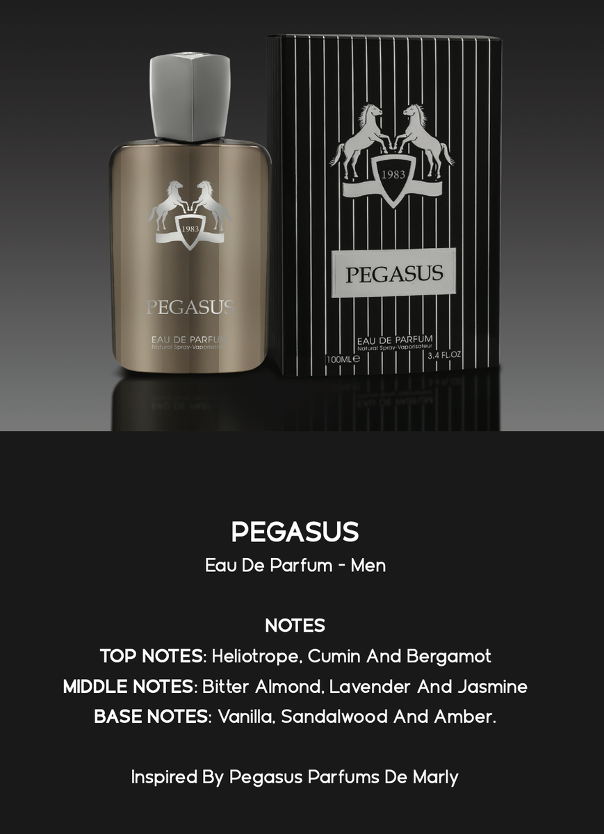 Découvrez Pegasus, un parfum raffiné pour hommes alliant héliotrope, cumin et bergamote en notes de tête. Profitez d'un cœur d'amande amère, lavande et jasmin, suivi d'une base sensuelle de vanille, bois de santal et ambre. Inspiré des Parfums De Marly, ce parfum est le choix parfait pour l'homme moderne et élégant.