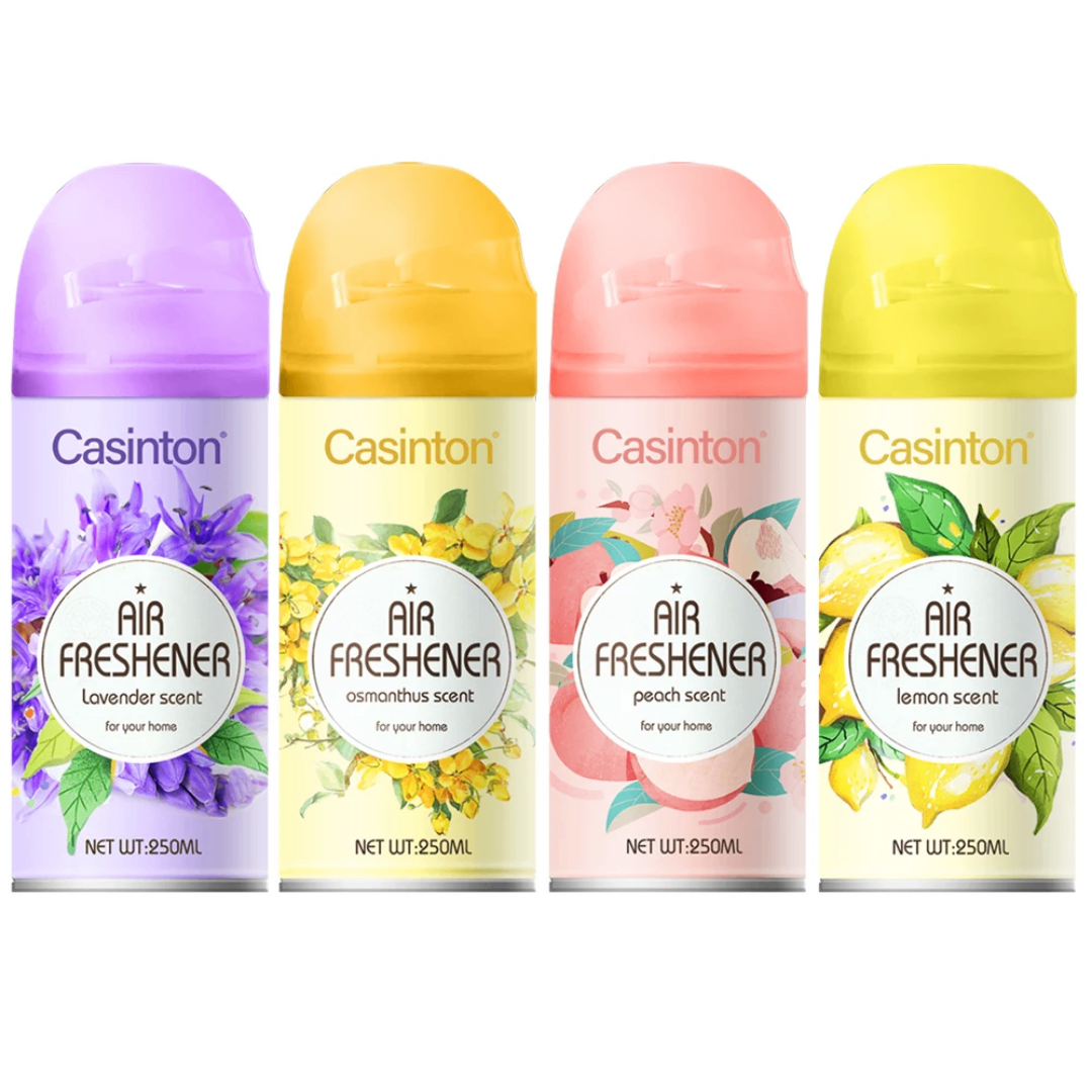 Découvrez notre assortiment de sprays désodorisants Casinton pour un intérieur frais. Chaque fragrance - lavande, osmanthus, pêche et citron - offre une ambiance unique et agréable. Idéal pour chaque pièce de votre maison. Transformez votre espace avec des arômes naturels et revitalisants. Flacon de 250ml facile à utiliser.
