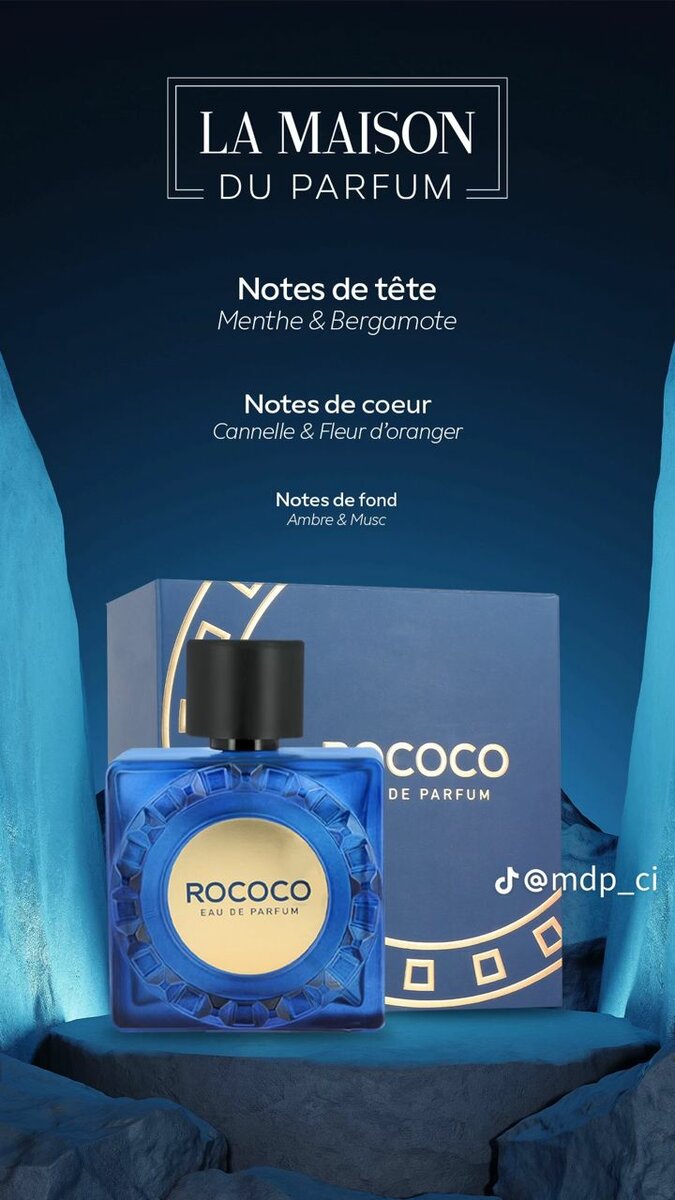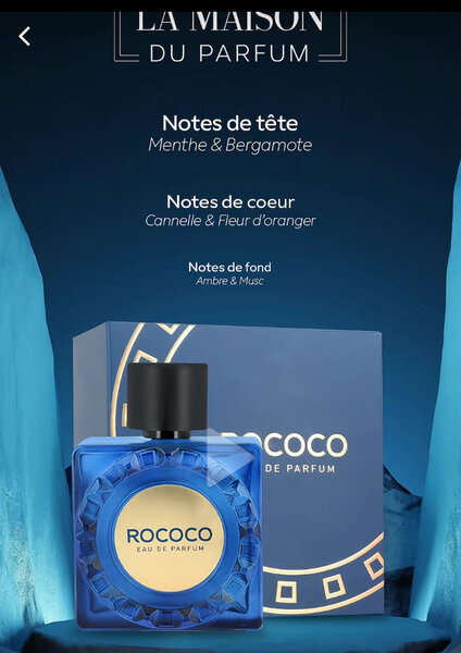 Découvrez l'essence sophistiquée du parfum Rococo, mélange de menthe fraîche, bergamote en tête, cœur de cannelle et fleur d'oranger, avec un fond ambré et musqué. Un choix parfait pour une présence inoubliable.