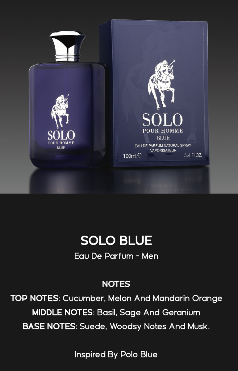 Découvrez la sophistication du Parfum Solo Blue pour Homme. Une fusion captivante de concombre, melon et mandarine en notes de tête, enrichie par le basilic, la sauge et le géranium au cœur. Les notes de fond de suède, bois et musc créent une empreinte inoubliable. Parfait pour l'homme moderne et élégant.