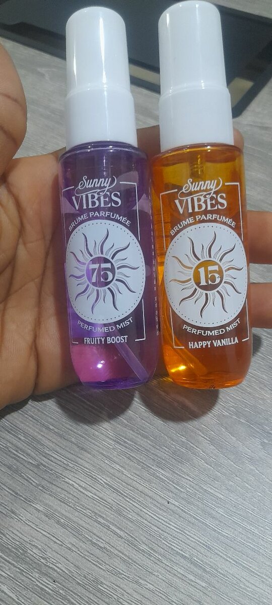 Découvrez les parfums Sunny Vibes - Fruity Boost et Happy Vanilla, essentiels pour une journée parfumée. Format pratique pour emporter partout avec vous. Idéal pour l'été ou simplement pour évoquer de bonnes vibrations!