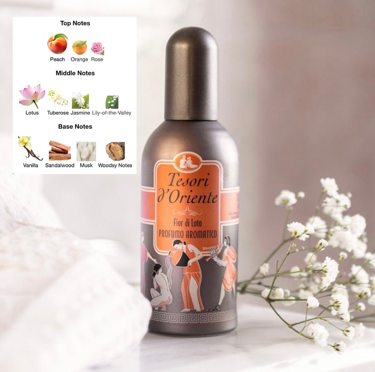 Découvrez le parfum envoûtant Tesori d'Oriente Fior di Loto. Ses notes de pêche, lotus et vanille créent une ambiance apaisante et raffinée. Idéal pour un usage quotidien, ce parfum est parfait pour sublimer votre style avec élégance et sophistication.