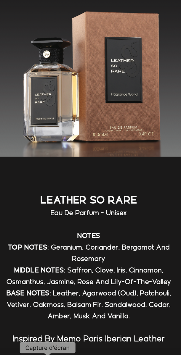 Découvrez un parfum unisexe incomparable, inspiré par la chaleur et l'élégance du cuir. Notes de tête vivifiantes de géranium et coriandre avec un cœur épicé de safran et jasmin. Une base riche en cuir et bois précieux pour une expérience olfactive unique. Parfait pour toute occasion.