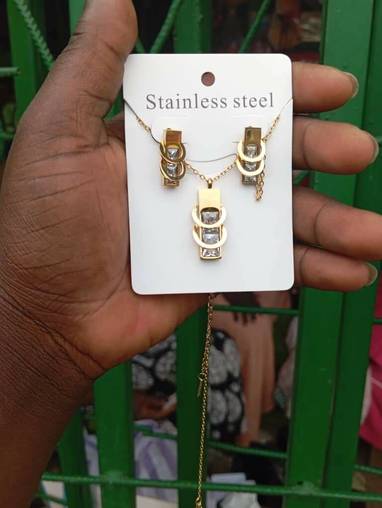 Élégante parure en acier inoxydable doré comprenant un collier et une paire de boucles d'oreilles. Idéale pour un look raffiné et moderne au quotidien. Résistant et durable.