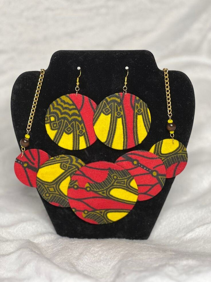 Découvrez l'élégance de notre parure africaine, fabriquée à la main avec des tissus wax colorés. Parfaite pour ajouter une touche ethnique à votre tenue, cette parure comprend un collier, des boucles d'oreilles et parfois un bracelet. Idéale pour les occasions spéciales ou pour donner une touche originale à votre style quotidien.