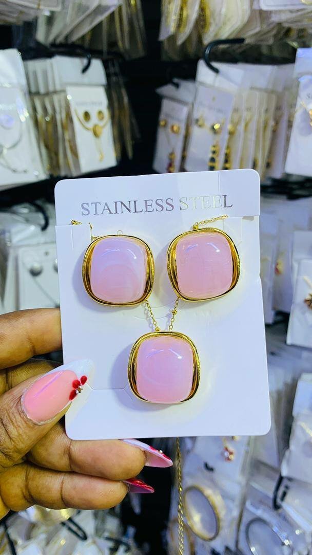 Élégante parure en acier inoxydable avec pendentif et boucles d'oreilles, ornée de pierres roses douces. Idéale pour ajouter une touche de sophistication à vos tenues quotidiennes ou soirées.