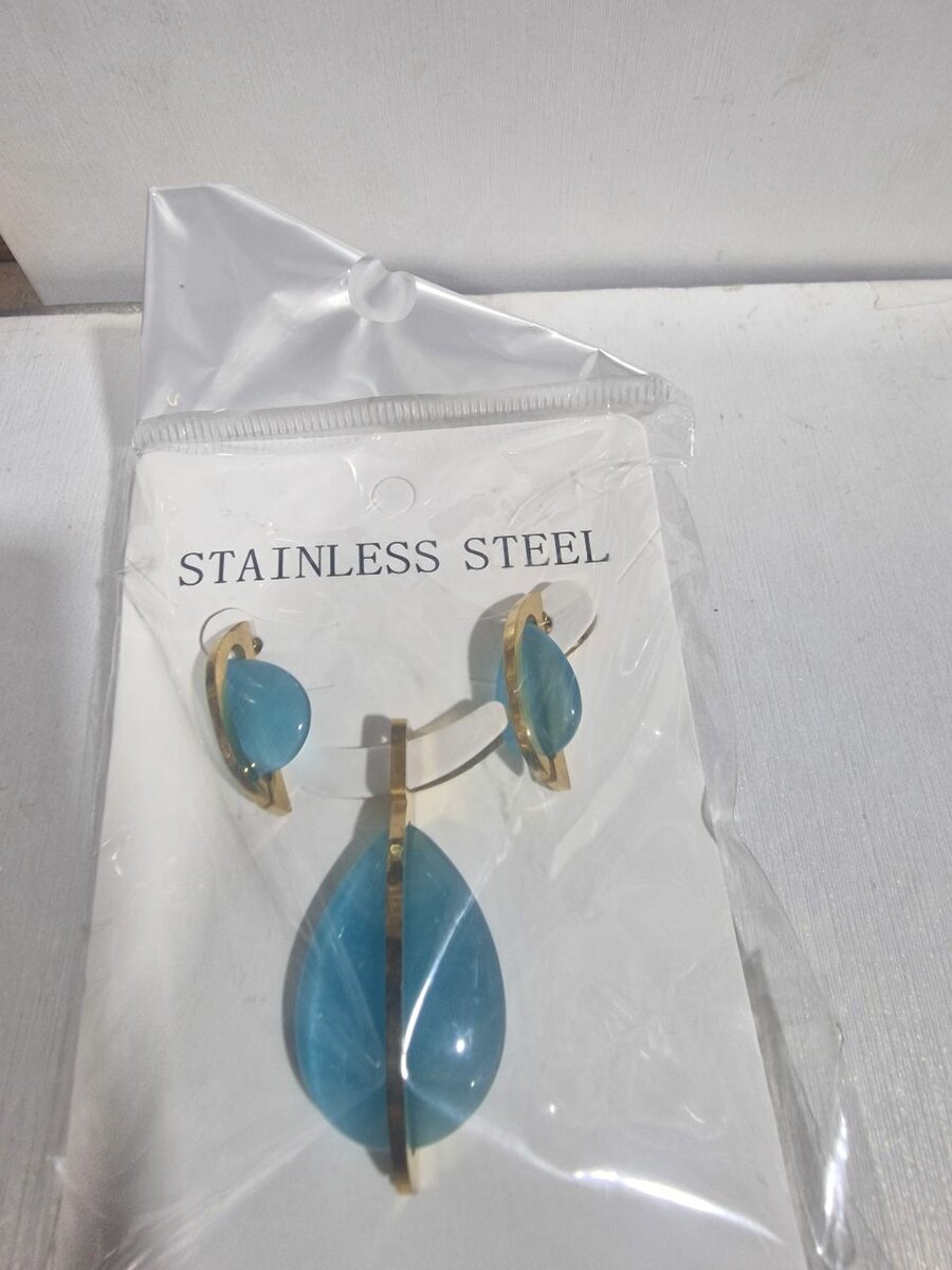 Éblouissante parure en acier inoxydable, composée d'un pendentif et boucles d'oreilles bleu. Idéale pour ajouter une touche d'élégance à toutes vos tenues.
