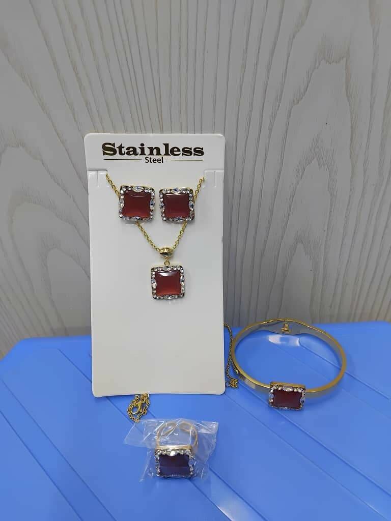Ensemble de bijoux élégant en acier inoxydable avec pendentif, bracelet, boucles d'oreilles et bague ornés de pierres rouges. Idéal pour un look chic et sophistiqué.