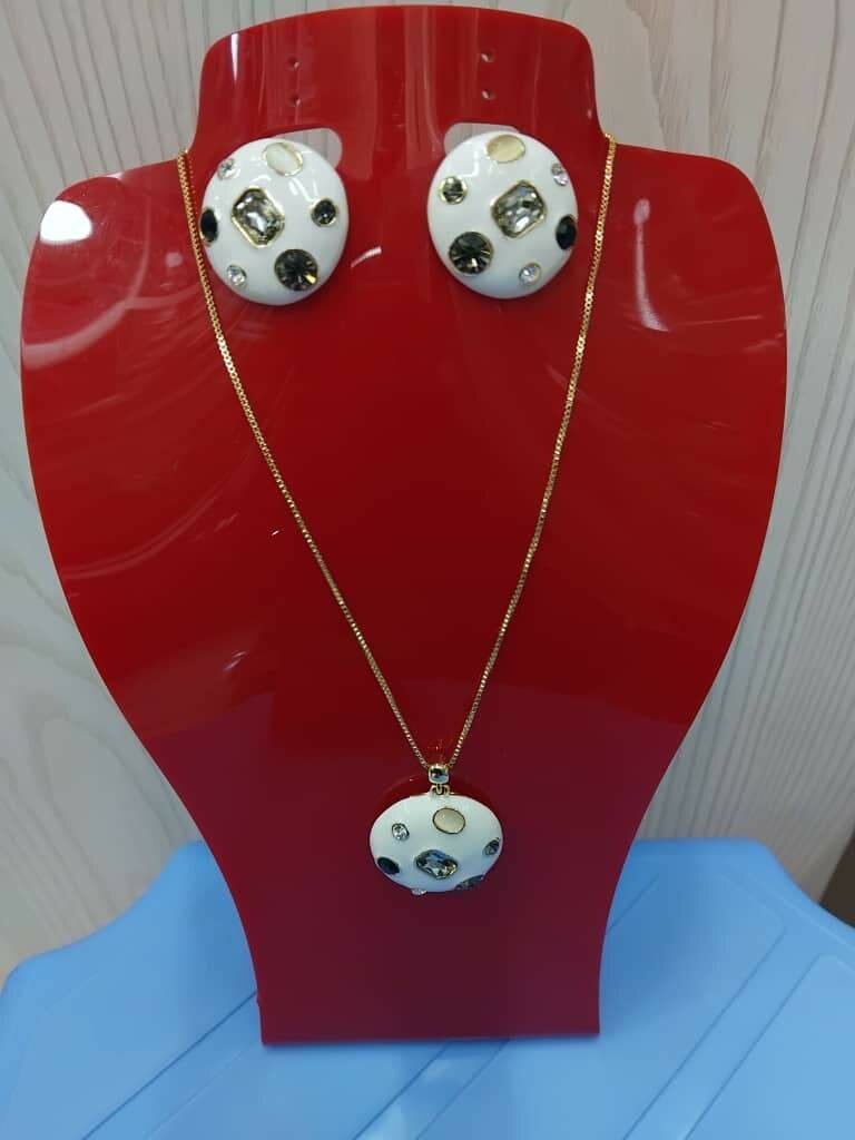 Élégante parure de bijoux comprenant un collier et des boucles d'oreilles en blanc avec accents dorés et pierres scintillantes. Idéale pour rehausser votre style lors d'occasions spéciales ou au quotidien. Un ajout parfait pour compléter votre garde-robe avec raffinement.