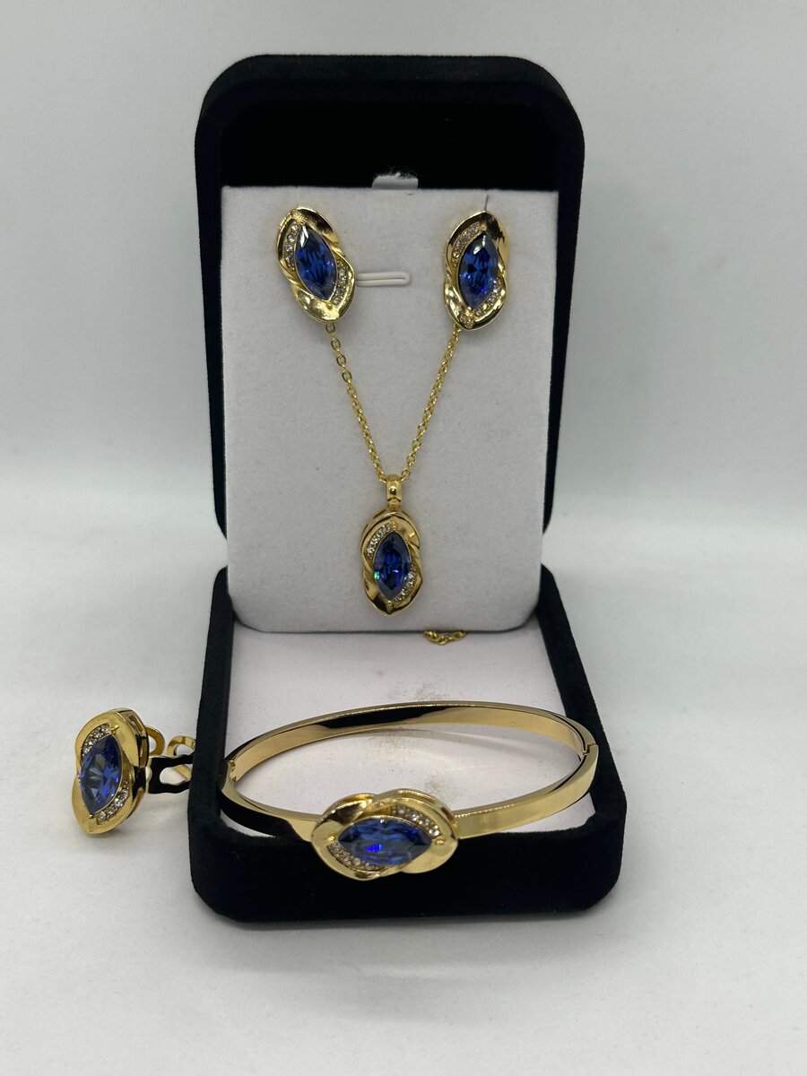 Élégante parure de bijoux dorée ornée de cristaux bleus, comprenant collier, boucles d'oreilles et bracelet. Idéale pour les occasions spéciales. Ajoutez une touche de sophistication à votre tenue.