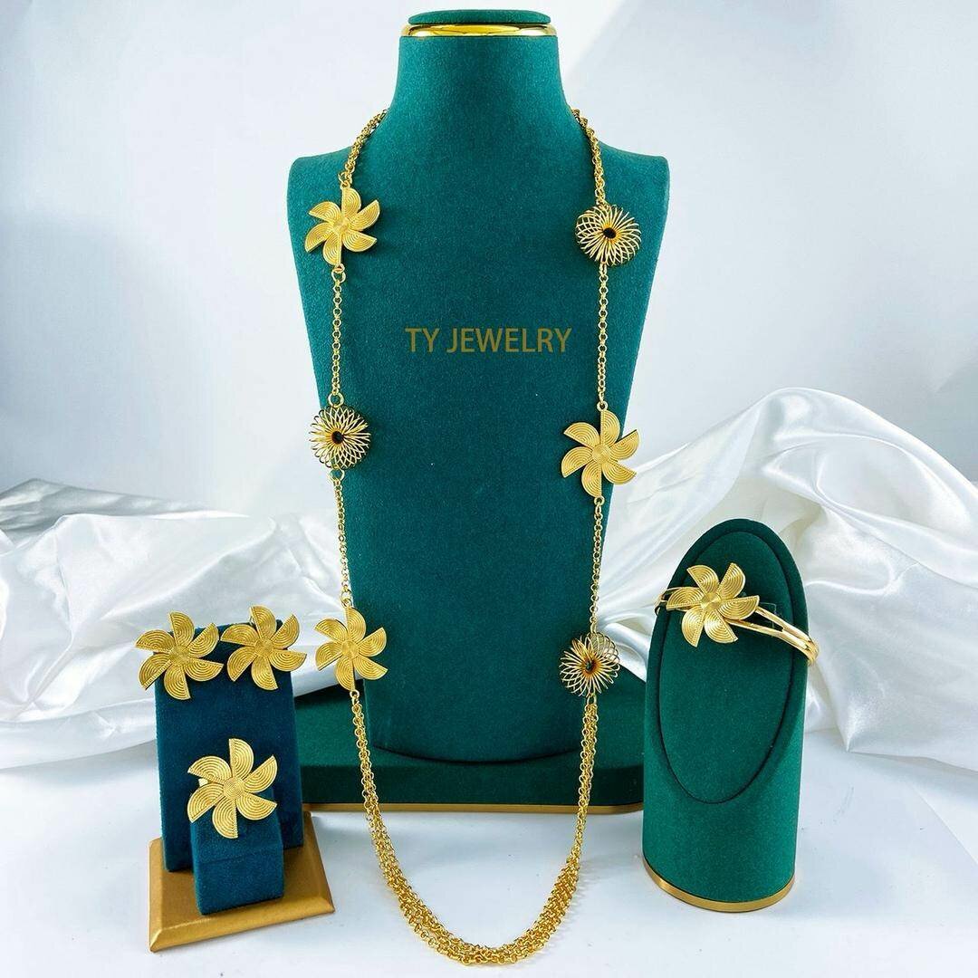 Sublimez votre tenue avec cette parure dorée élégante. Comprend un collier, des boucles d'oreilles et un bracelet assorti, tous ornés de motifs floraux. Idéal pour des occasions spéciales ou un look quotidien raffiné.