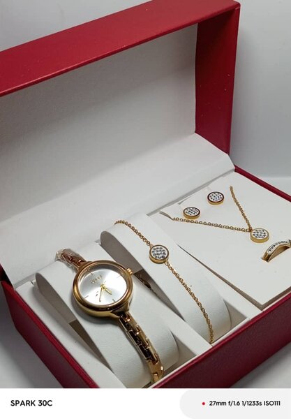 Offrez-vous l'élégance avec cette parure de bijoux dorée, enrichie de pierres rouges captivantes. Comprend une montre, un bracelet, des boucles d'oreilles et un collier assorti. Parfait pour des occasions spéciales, cette collection ajoute une touche de sophistication à toute tenue. Idéal pour celles qui aiment briller avec style et raffinement. Faites sensation et affirmez votre personnalité avec ce coffret unique.
