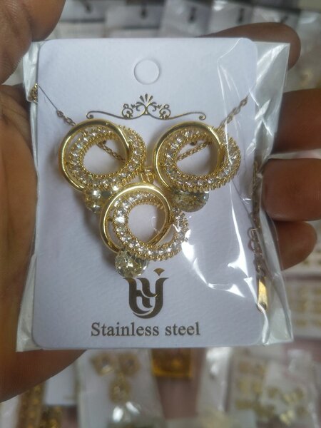 Éblouissante parure de bijoux dorée ornée de strass étincelants. Comprend un collier, un bracelet, des boucles d'oreilles et une bague. Parfaite pour ajouter une touche d'élégance à n'importe quelle tenue. Idéale pour les occasions spéciales ou les soirées.