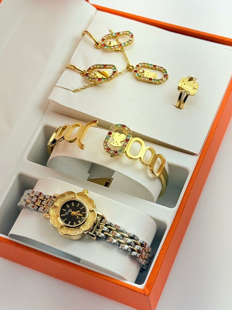 Découvrez cette élégante parure de bijoux dorés, parfaite pour rehausser votre look. Comprend une montre raffinée, un bracelet, des boucles d'oreilles et un collier assortis. Idéale pour des occasions spéciales ou un usage quotidien pour ajouter une touche de glamour.