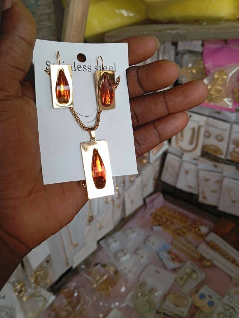 Élégante parure de bijoux en acier inoxydable avec pendentif et boucles d'oreilles ambre. Design raffiné, idéal pour toutes les occasions. Résistant à l'usure, brillant durablement.