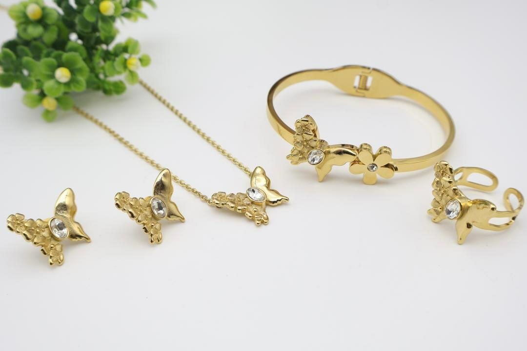 Élevez votre style avec cette élégante parure bijoux papillon doré. Composée d'un collier, bracelet, bague et boucles d'oreilles, chaque pièce est ornée de charmants papillons et incrustée de cristaux étincelants. Idéale pour les occasions spéciales ou pour ajouter une touche d'élégance au quotidien. Parfaite pour les amoureux de la nature et du style élégant.