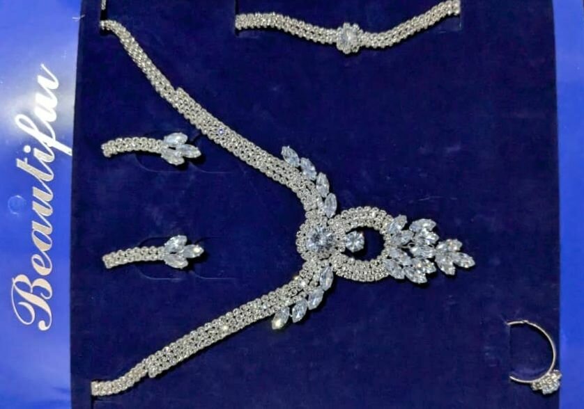 Sublimez vos tenues avec cette parure de bijoux étincelante en strass comprenant un collier, des boucles d'oreilles, un bracelet et une bague assortie. Parfaite pour des occasions spéciales, elle attire le regard avec son design raffiné et sa brillance spectaculaire. Idéale pour un look élégant et sophistiqué.
