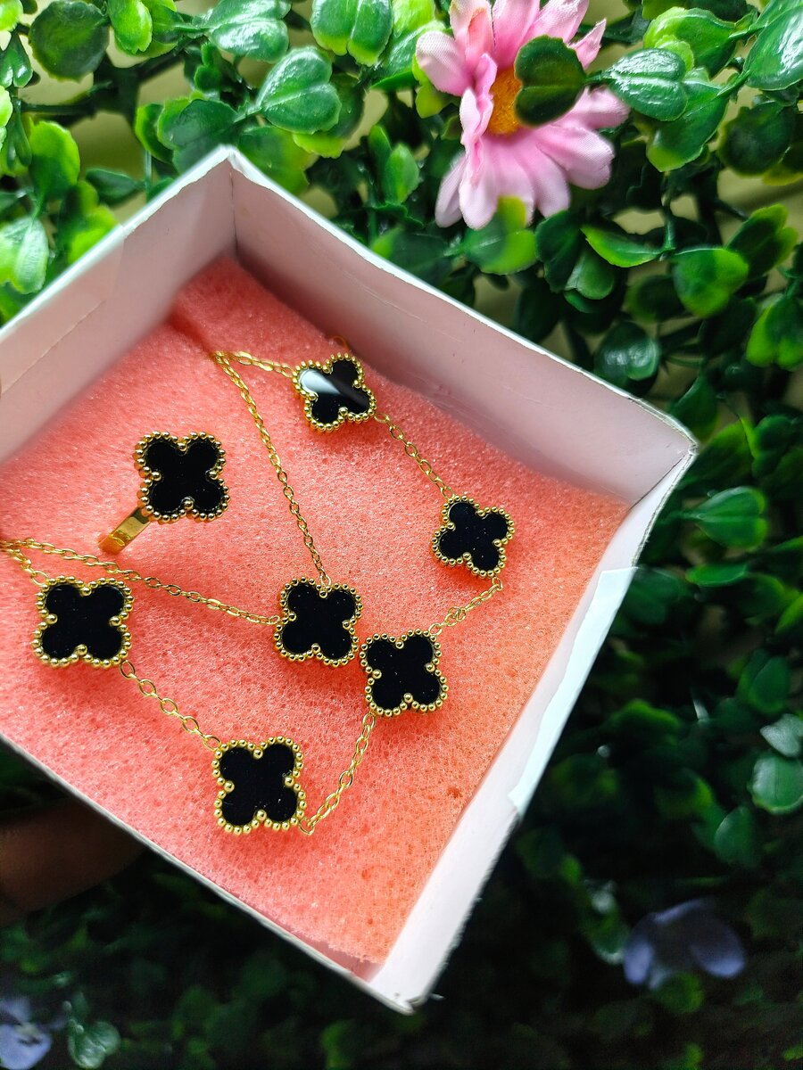Élégante parure de bijoux avec motif trèfle noir, idéale pour compléter votre tenue avec style. Composée d'un collier, boucles d'oreilles et une bague, cette parure apporte une touche de sophistication et de modernité. Parfait pour les occasions spéciales ou un cadeau raffiné. Bague, chaîne, gourmette.