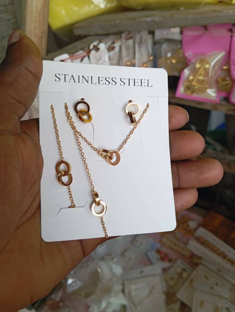 Élégante parure en acier inoxydable incluant un collier et des boucles d'oreilles assorties. Design moderne avec des cercles entrelacés, cette parure est idéale pour ajouter une touche chic à vos tenues. Résistant à la corrosion.