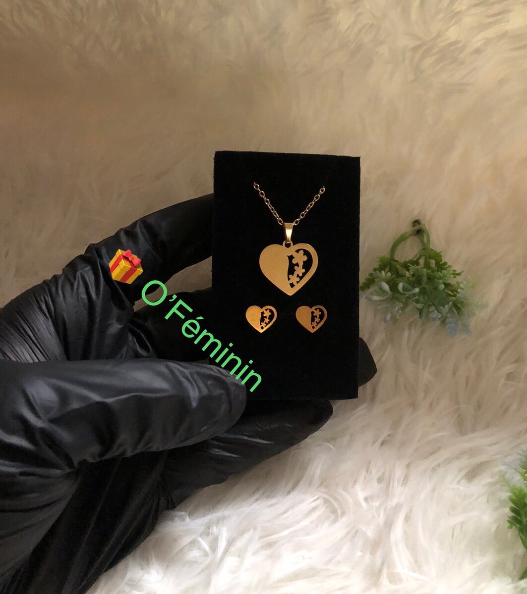 Découvrez la parure en forme de cœur avec motifs puzzle. Idéale pour exprimer votre amour et votre singularité, elle comprend un collier et des boucles d'oreilles assortis. Parfaite pour un cadeau ou une soirée spéciale.