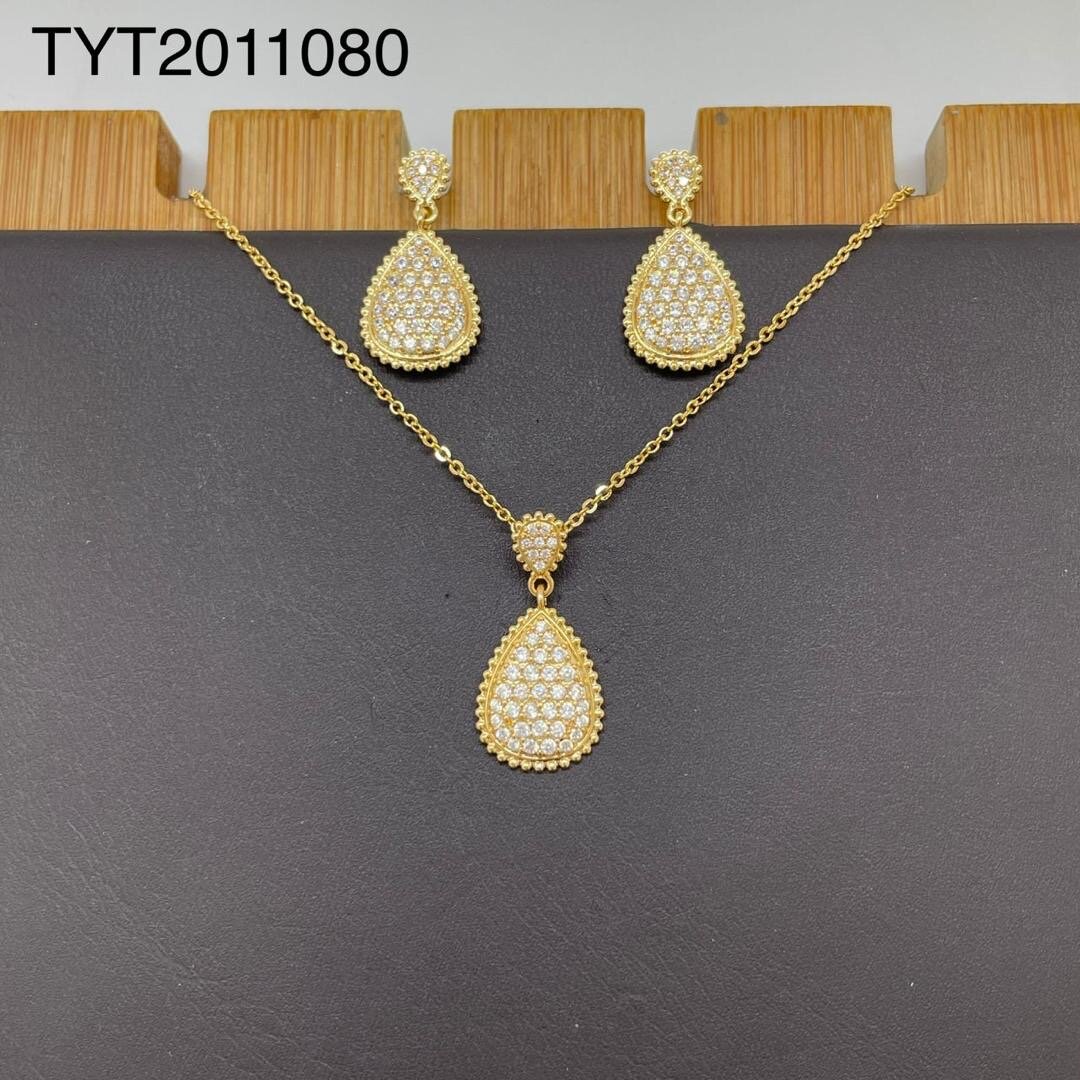 Élégante parure contenant un collier et des boucles d'oreilles dorées, ornée de cristaux étincelants. Parfaite pour ajouter une touche de glamour à vos tenues.